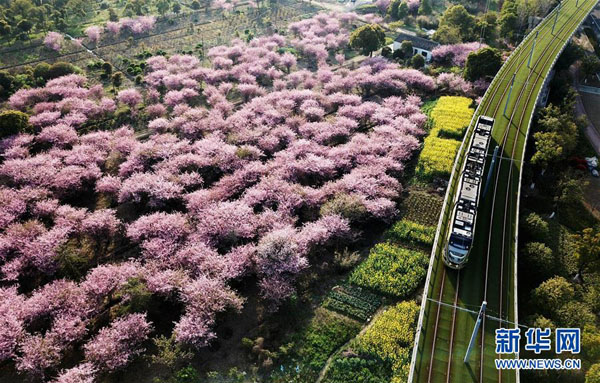 在江苏苏州高新区,一辆有轨电车从一片盛开的垂丝海棠旁驶过(2018年3月28日摄)。 新华社发(徐志强 摄)