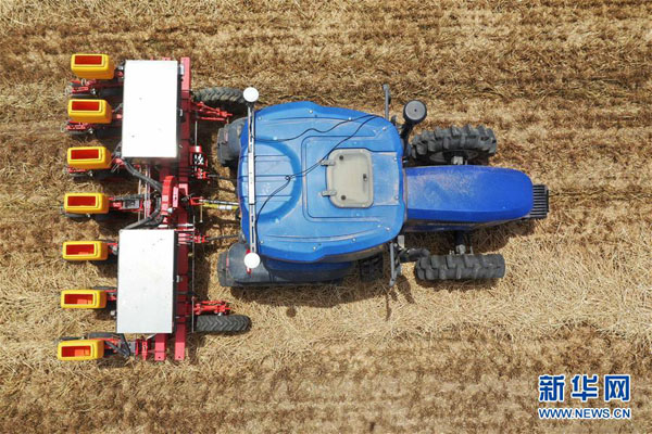 在河南省邓州市小杨营镇安众村,加装有北斗导航系统的拖拉机在无人驾驶状态下播种(2020年5月26日摄,无人机照片)。 新华社记者 冯大鹏 摄