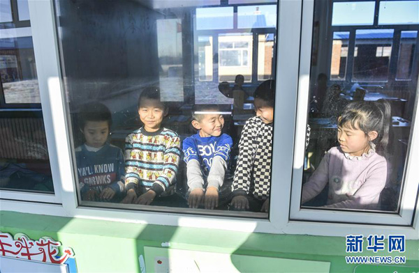 吉林省德惠市边岗乡卧虎村小学学生在户外活动后围着教室内的环流散热器取暖(2018年12月26日摄)。 新华社记者 许畅 摄