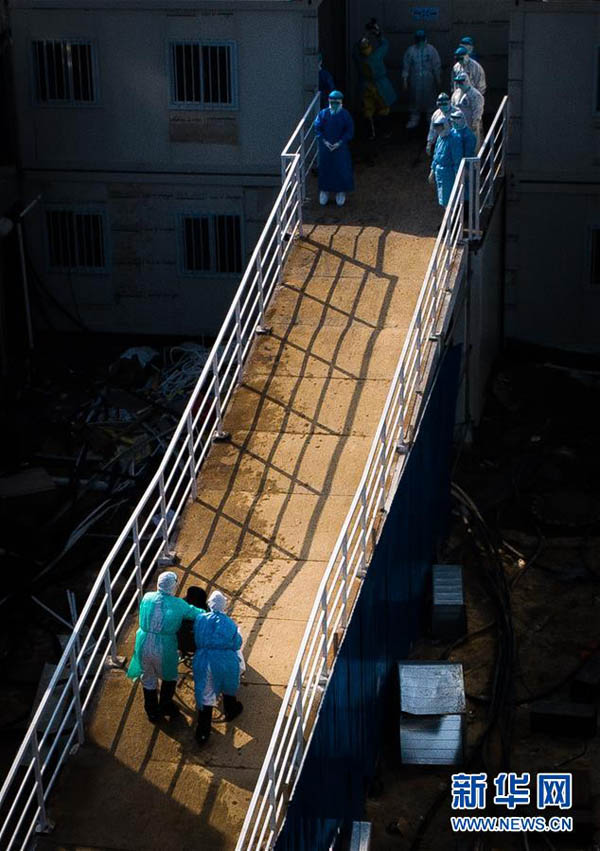 医护人员将患者送入武汉火神山医院病房(2020年2月4日摄,无人机照片)。 新华社记者 肖艺九 摄