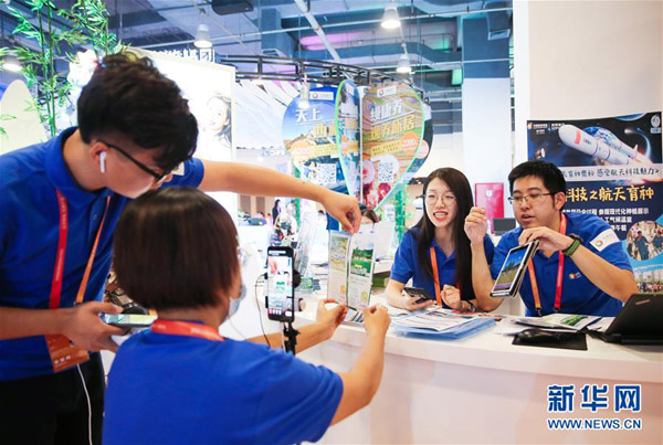在2020年中国国际服务贸易交易会旅游服务专题展区,中国旅游集团展位的工作人员通过直播向线上观众介绍旅游服务产品(2020年9月5日摄)。 新华社记者 潘思危 摄