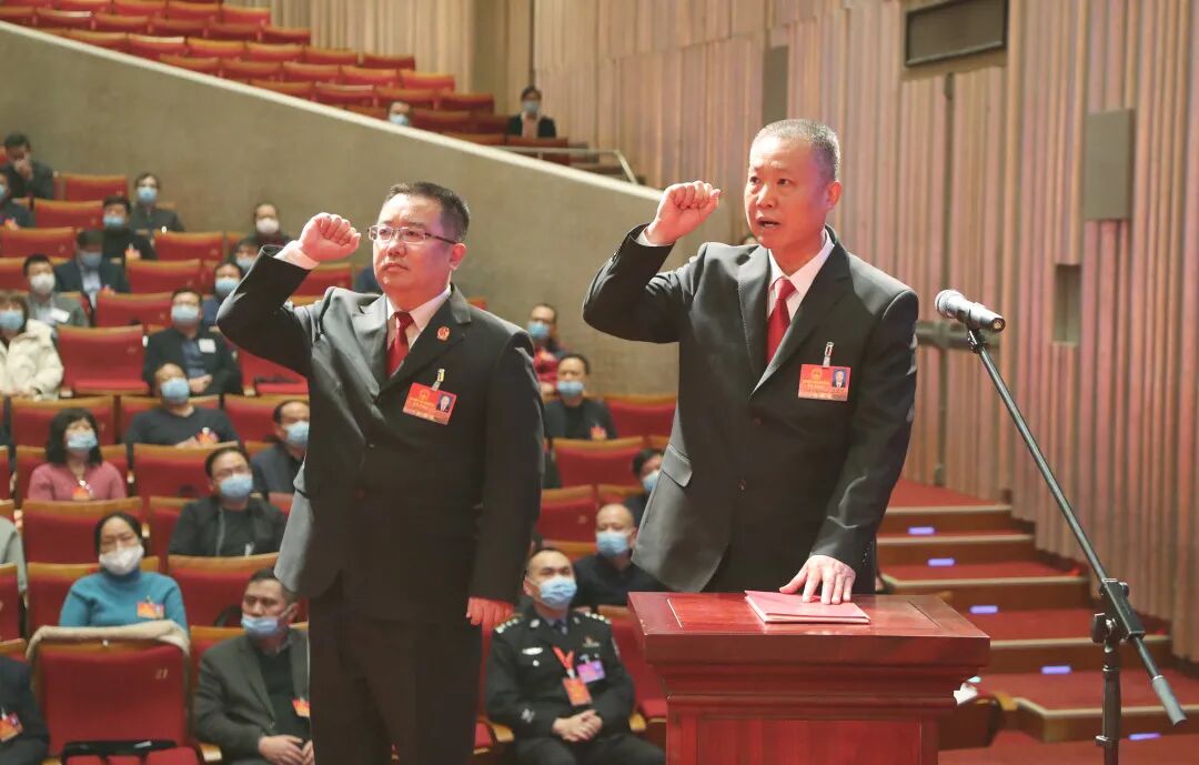 1月15日下午,在宜兴市第十七届人民代表大会第五次会议上,经人大代表们认真审议后表决,宜兴法院工作报告获全票通过。方海明同志高票当选为宜兴市人民法院院长,并进行了宪法宣誓。