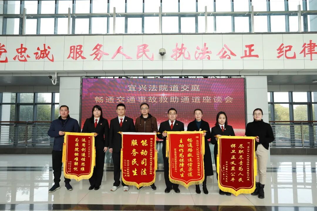 2月8日下午,江苏省道路救助基金管理人紫金保险公司、宜兴市人民医院、宜兴市中医医院、宜兴市第二人民医院四家机构的工作人员向宜兴法院道路交通事故审判庭送上锦旗及感谢信,为法庭缓解道路救助基金“追偿难”问题所做的工作表示谢意。