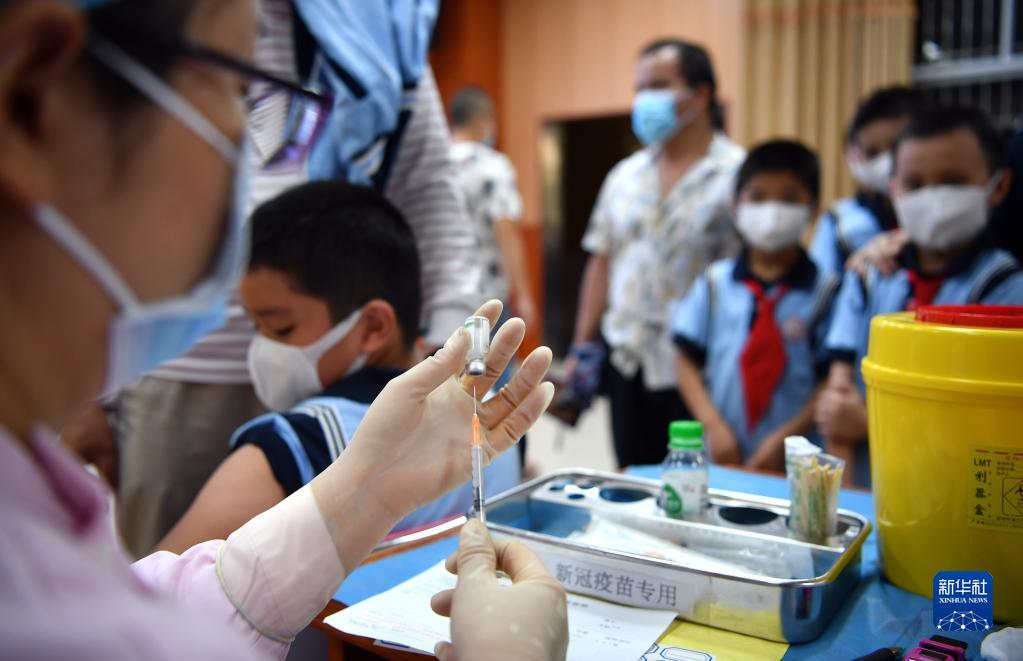 医护人员在海口市琼山第三小学为学生接种疫苗(2021年10月28日摄)。新华社记者郭程 摄