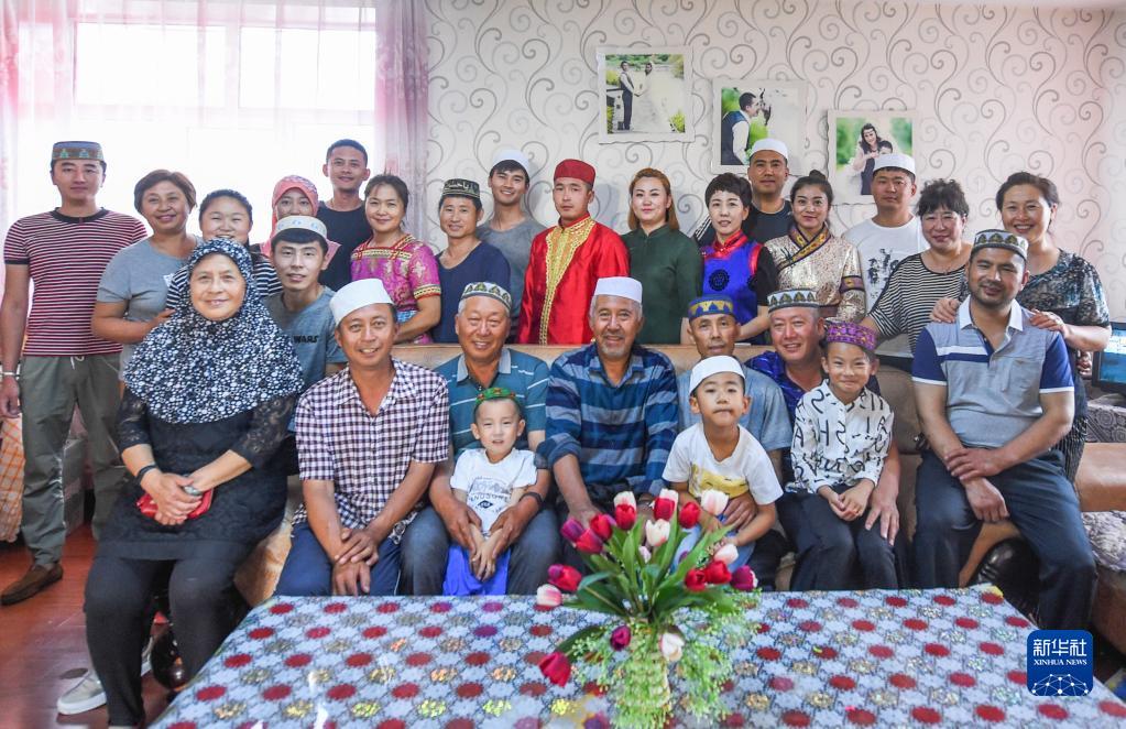 这是家住内蒙古呼伦贝尔的夏民山(前排右三)家的家庭合影。他家由回族、汉族、蒙古族、达斡尔族、鄂温克族、满族共6个民族组成,45口人,三代同堂(2017年7月16日摄)。新华社记者连振 摄