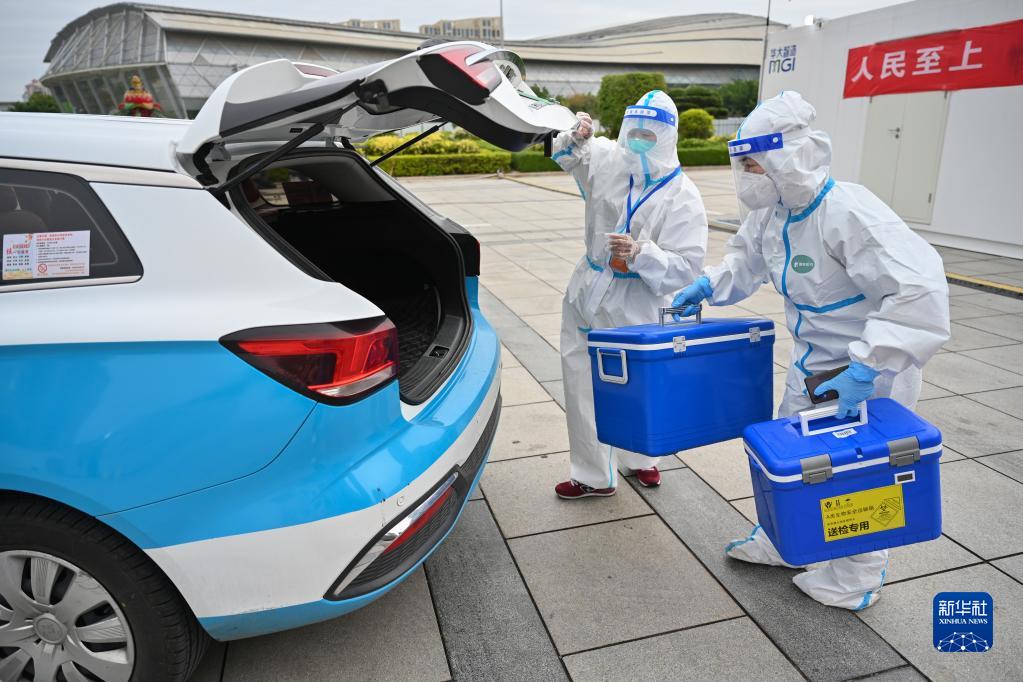 3月24日,在福建泉州市海峡体育中心联合方舱核酸检测基地,参加“抗疫志愿车队”的出租车司机(左)协助医务人员装运核酸检测样本。新华社发(周义摄)