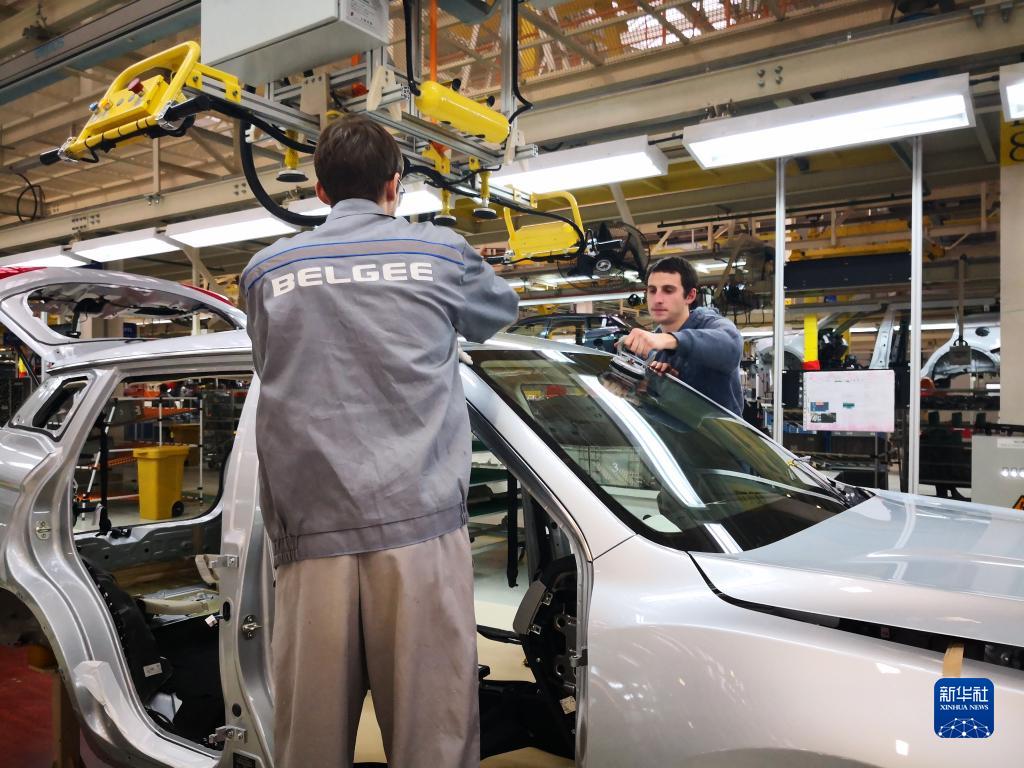这是2018年12月1日在白俄罗斯首都明斯克东北方向50公里处的白俄罗斯吉利全散件汽车制造厂总装车间拍摄的工人组装车体。新华社记者 张若玄 摄